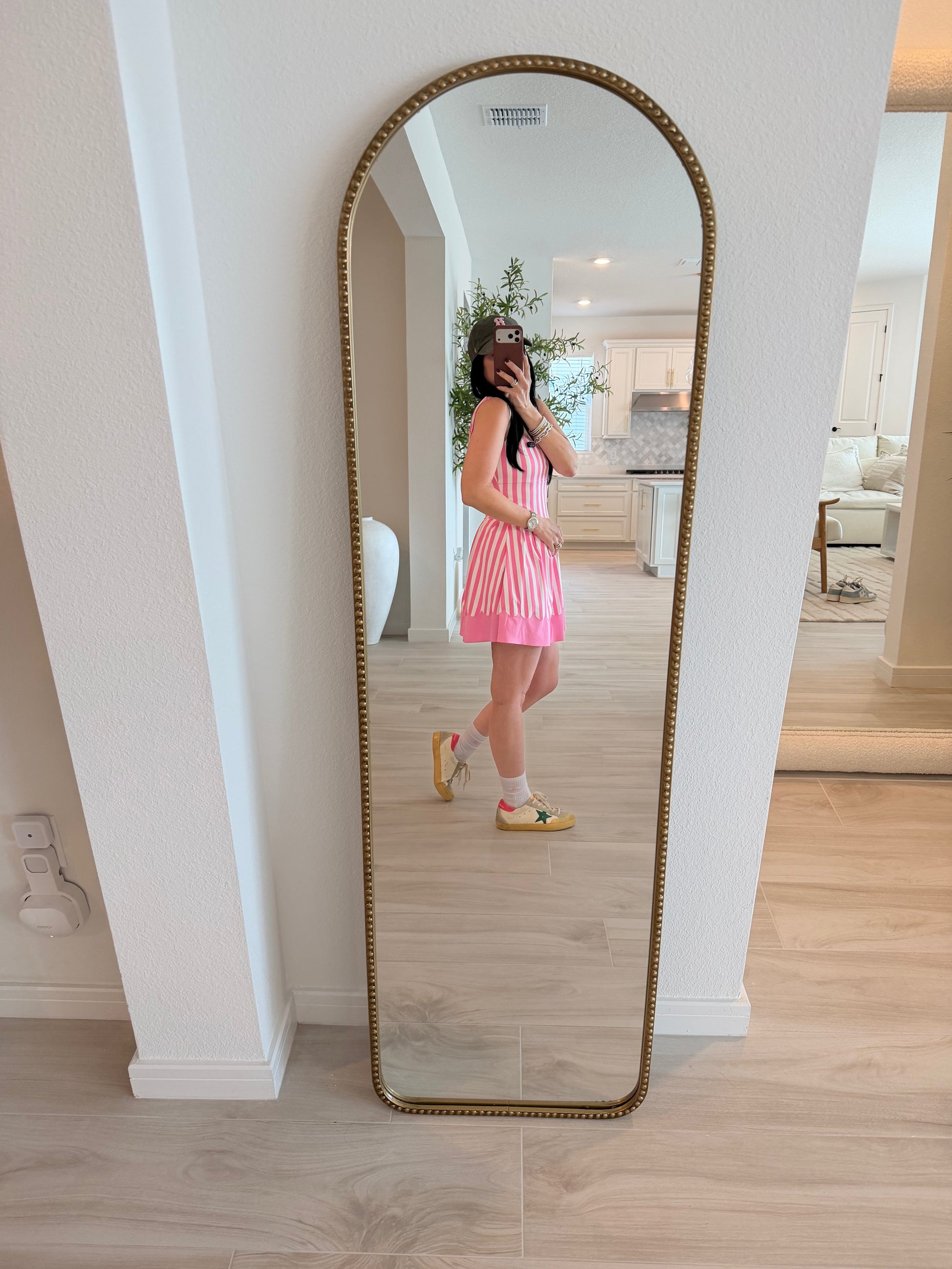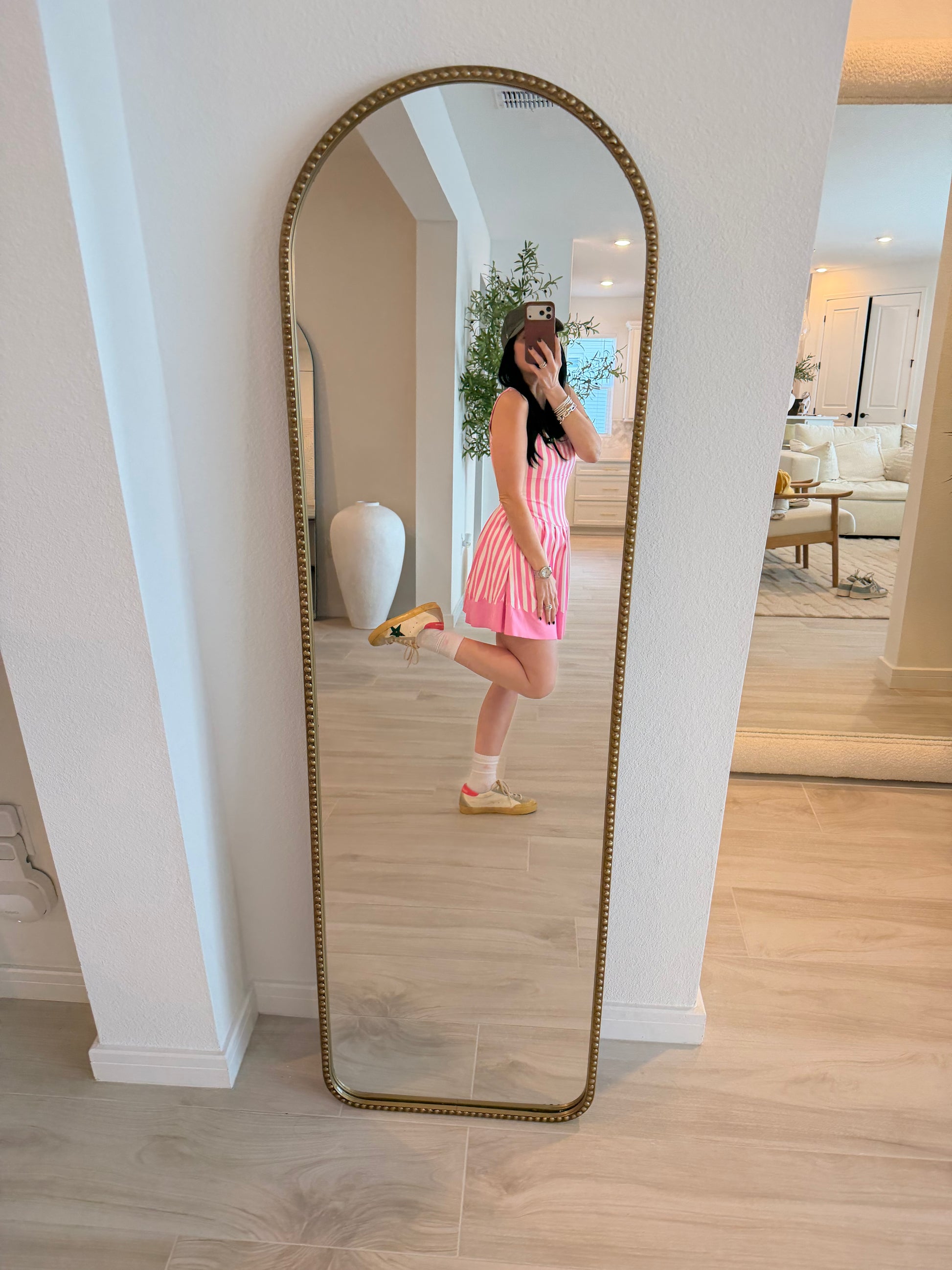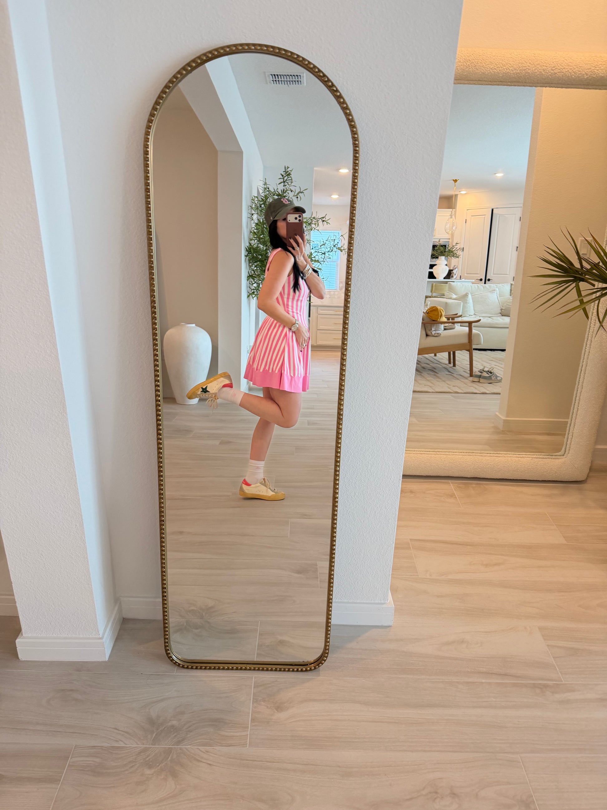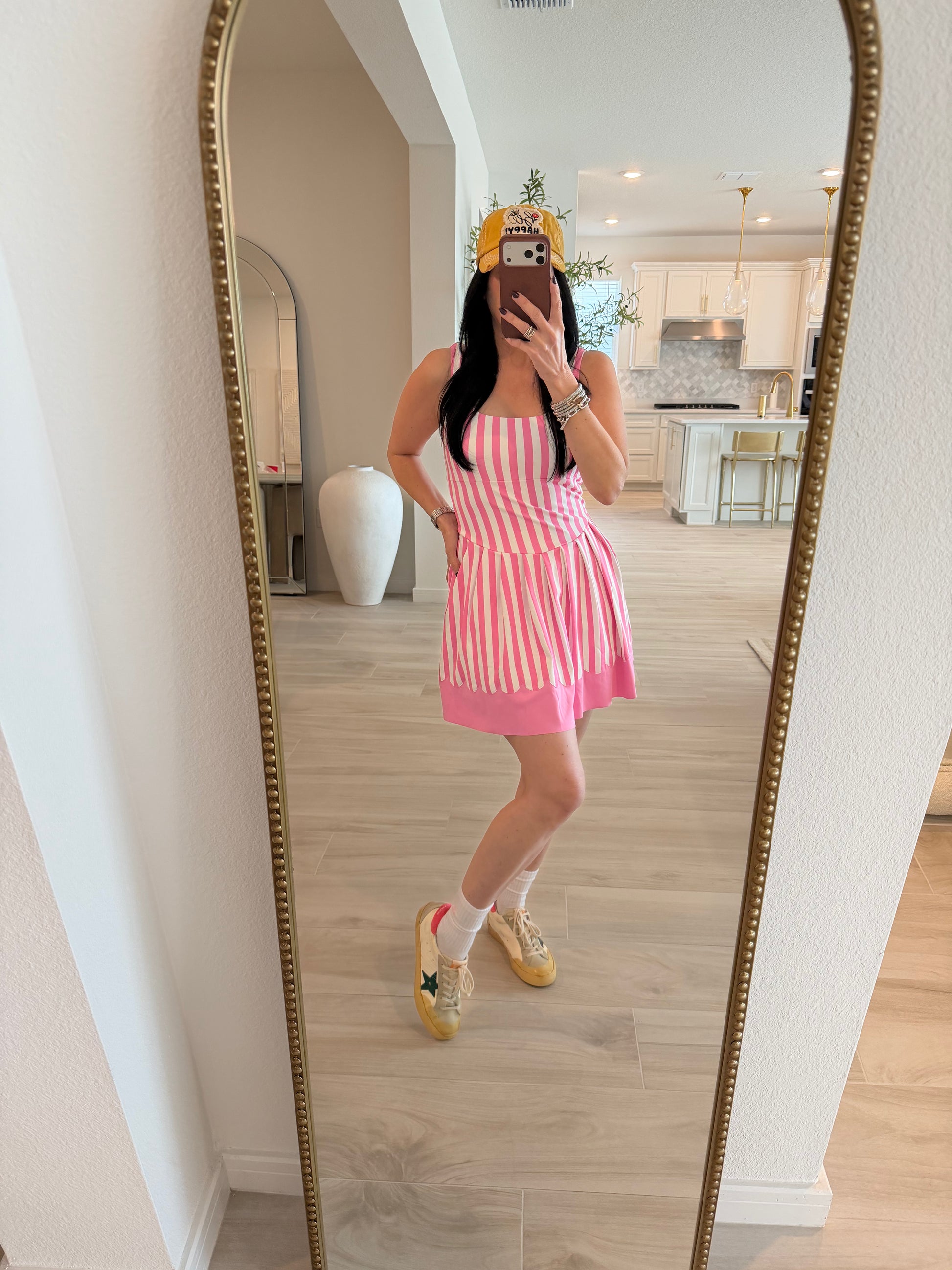 Engineered for movement, this pleated active skort features bold wide stripes and a refined scallop hem. The integrated shorts provide coverage and support during workouts or casual wear, while the structured pleats add dimension and style. A versatile piece that transitions seamlessly from gym to street.